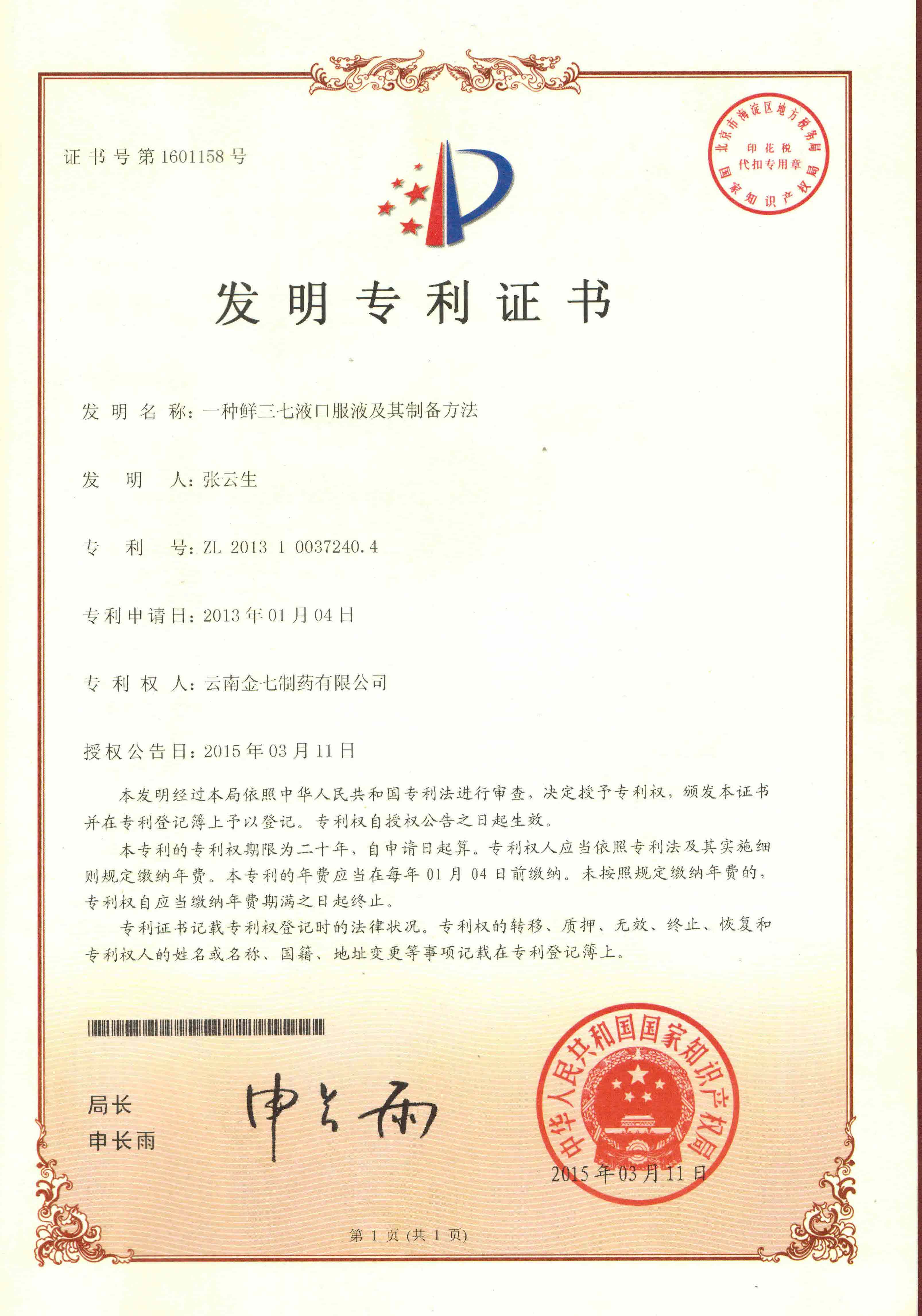 打造企業的持續發展競爭力。通過多年的努力,公司申報了專利55項、獲得專利授權33項,取得國家新藥證書1個,藥品生產批準文號8個,保健食品批準文號2個,其中藥品七葉神安滴丸、保健食品三七口服液為全國獨家專利品種。